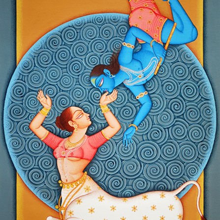 Chhotu Lal’s art works reflect his training in traditional Indian miniature paintings and his interest in mythology. However he has adapted this technique to suit his own style of more contemporary imagery. His paintings juxtapose symbols and modern signs of life with his depiction of mythological stories and religious icons. He paints in small format usually in opaque water colour –the pigments home-made with mineral and vegetal extracts.